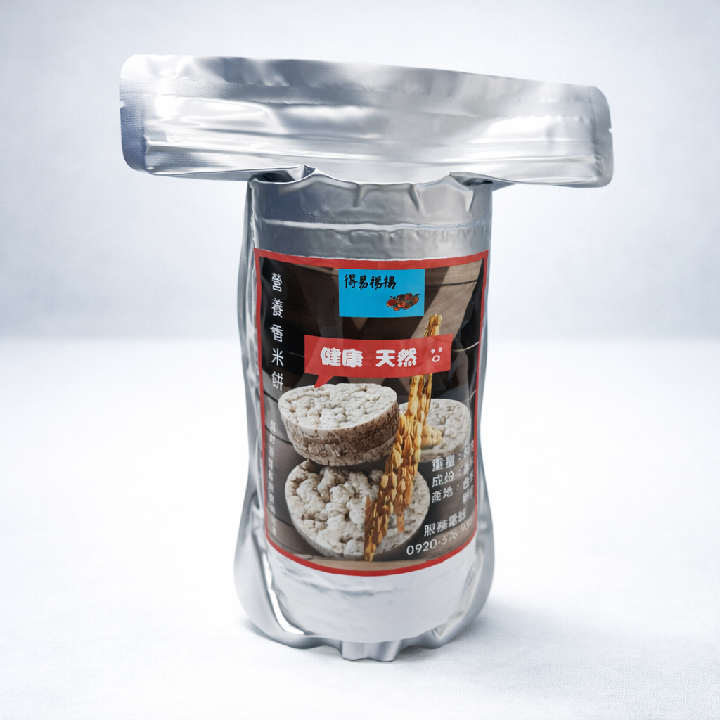 「得易楊楊營養香米餅」是由稻米原粒直接產製而成,稻米係採用香米品種,是本農場通過有機認證的農產品之一,以自然農法用心栽培管理,並以自然的太陽光曬穀乾燥以減少碳排量,再經風鼓機風選,篩選掉不良的稻榖,而留下顆粒飽滿的穀子,並經自家碾米機碾成稻米,故本米餅是100%使用台灣本土米,是讓您吃出健康又安心的農產品。